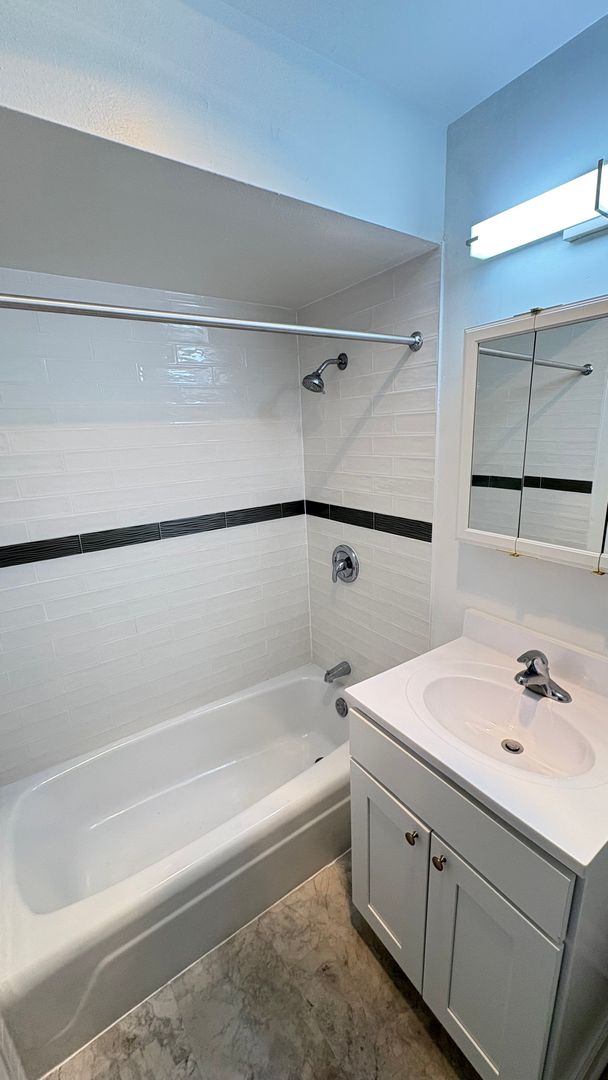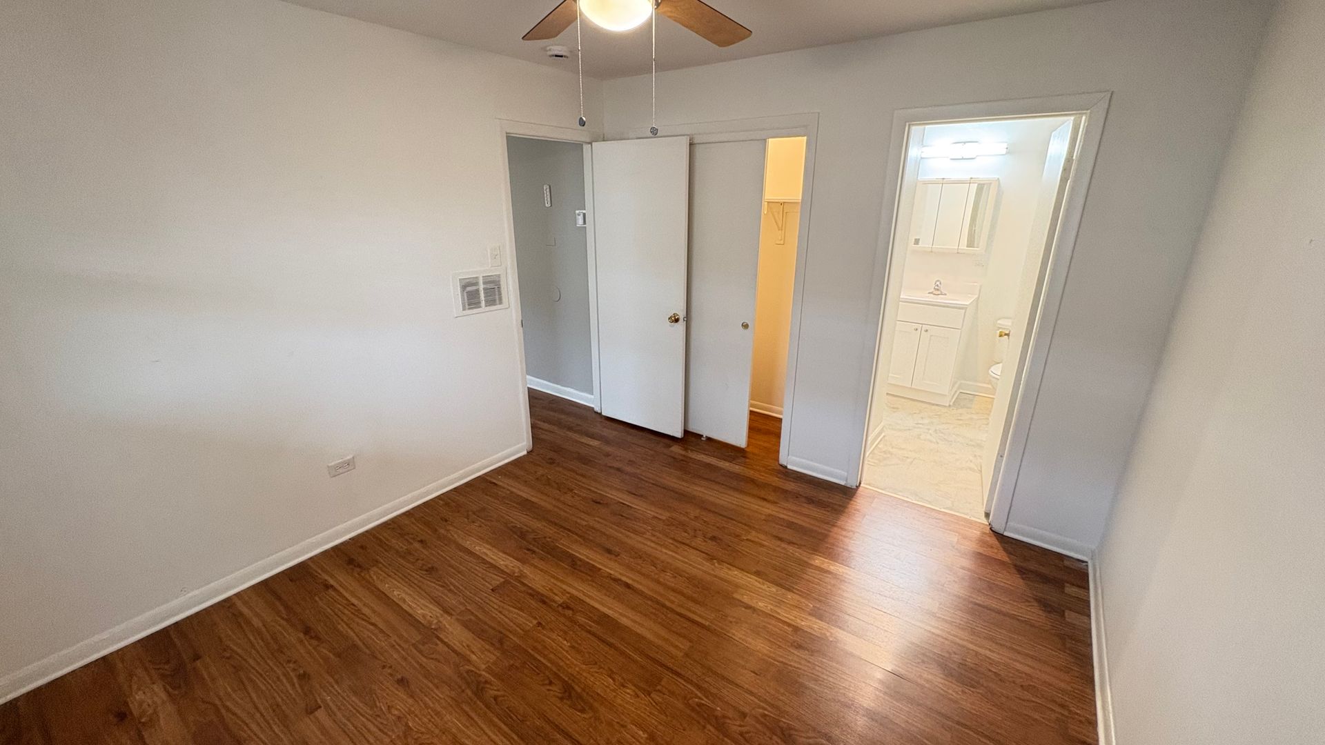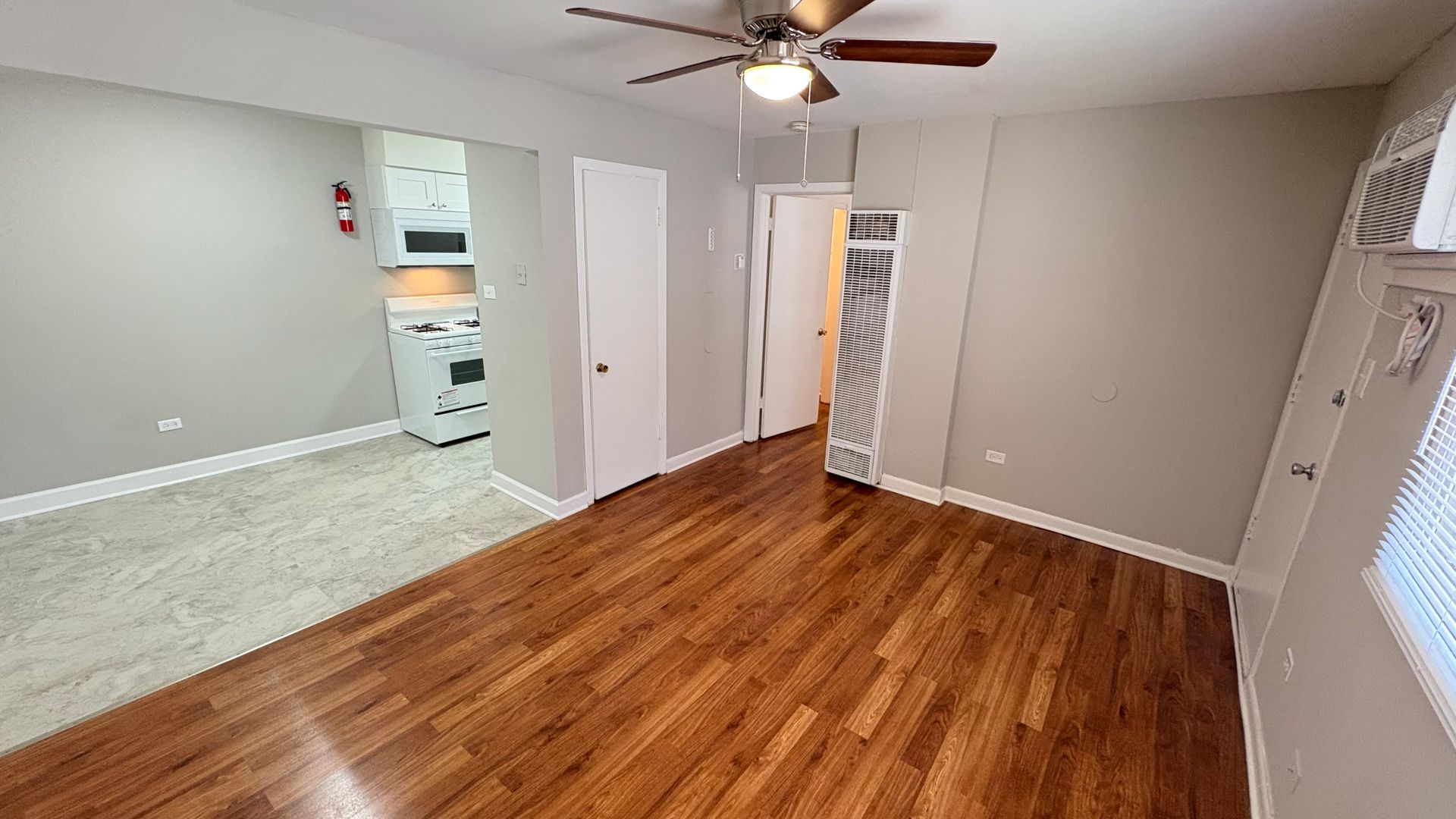 This beautiful 510 sq ft apartment comes with newly waxed vinyl wood plank flooring throughout the front room and bedroom, along with modern ceiling fans added to both. A/C included to the front room. Newly renovated kitchen has a microwave above the stove to free counter space, along with new appliances. The en suite bathroom is also newly updated, and features a vanity and modern lighting.