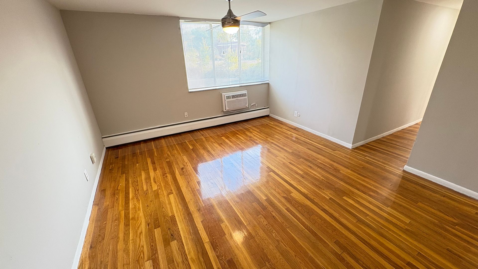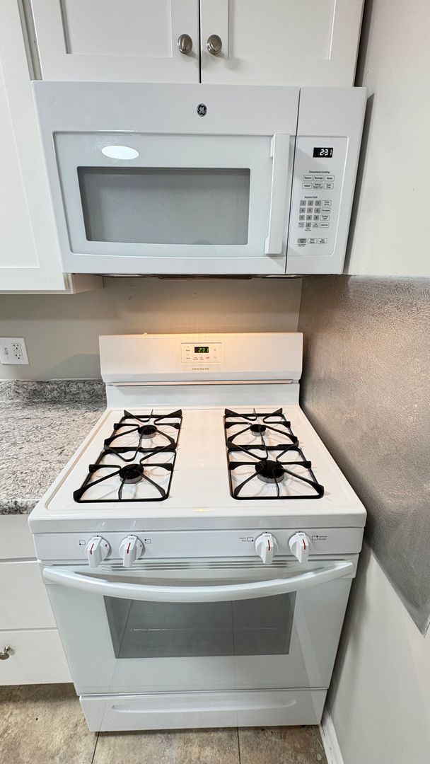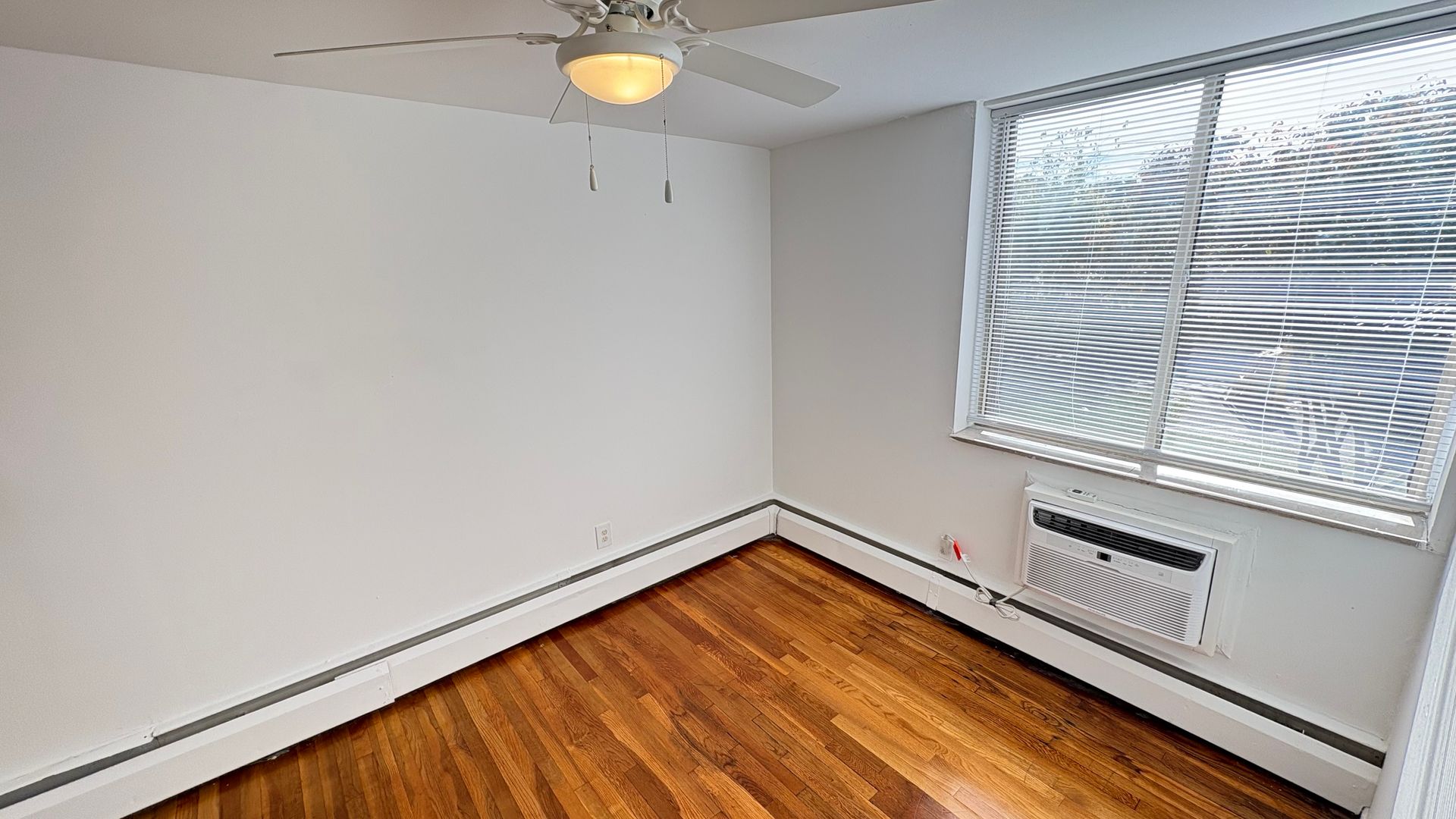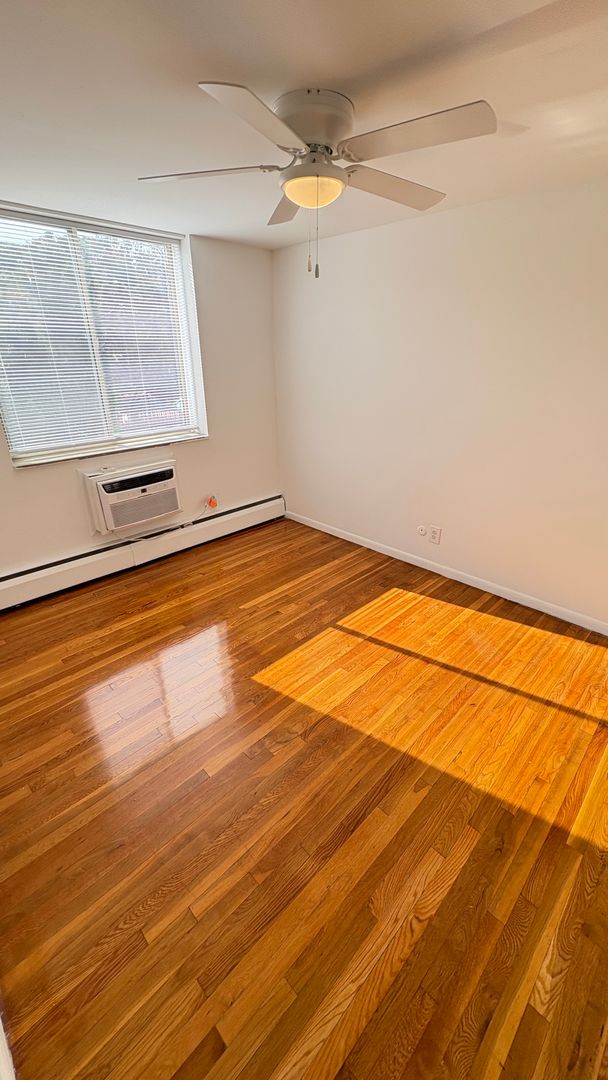 This is a first level, 947 sq ft hardwood floor apartment, featuring updated appliances in the kitchen including a stove, microwave, and refrigerator. Air conditioning units and ceiling fans included in the front room and both bedrooms. Large windows throughout the space allow for natural lighting. Both the main and half-bathrooms include updated amenities.