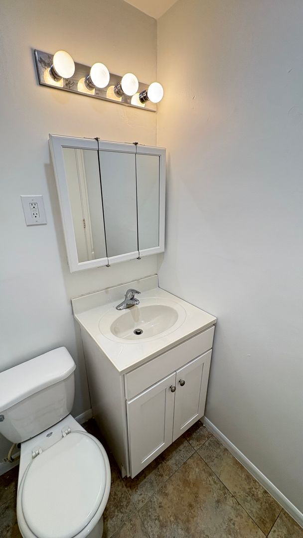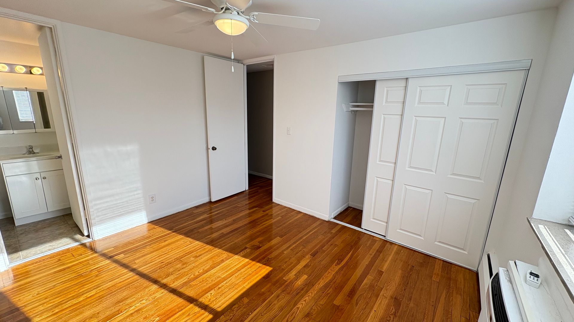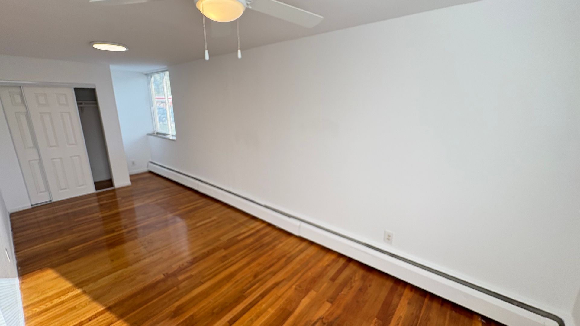 This is a first level, 947 sq ft hardwood floor apartment, featuring updated appliances in the kitchen including a stove, microwave, and refrigerator. Air conditioning units and ceiling fans included in the front room and both bedrooms. Large windows throughout the space allow for natural lighting. Both the main and half-bathrooms include updated amenities.
