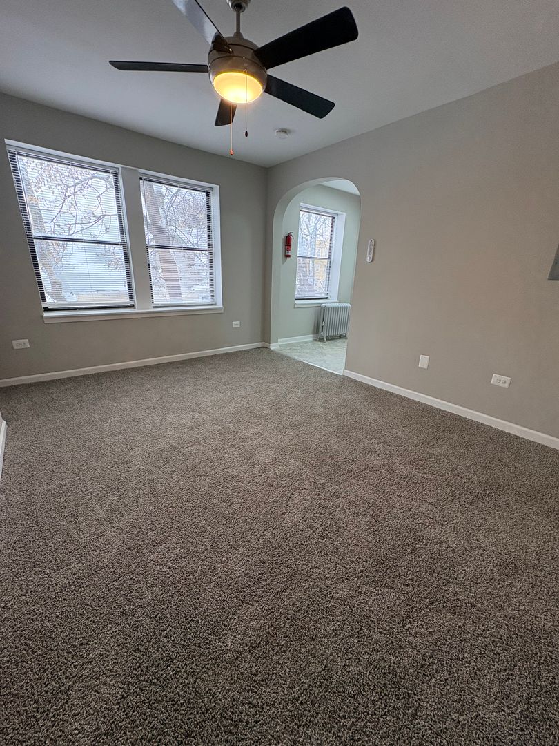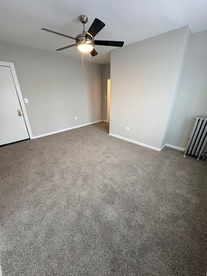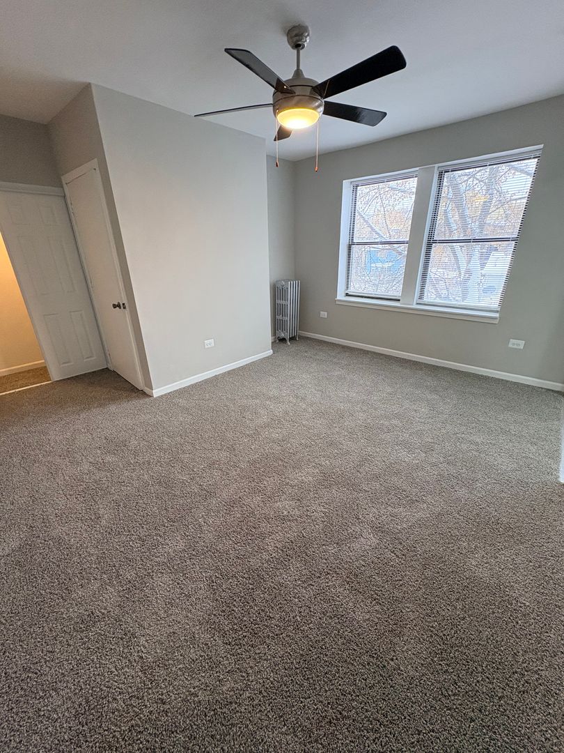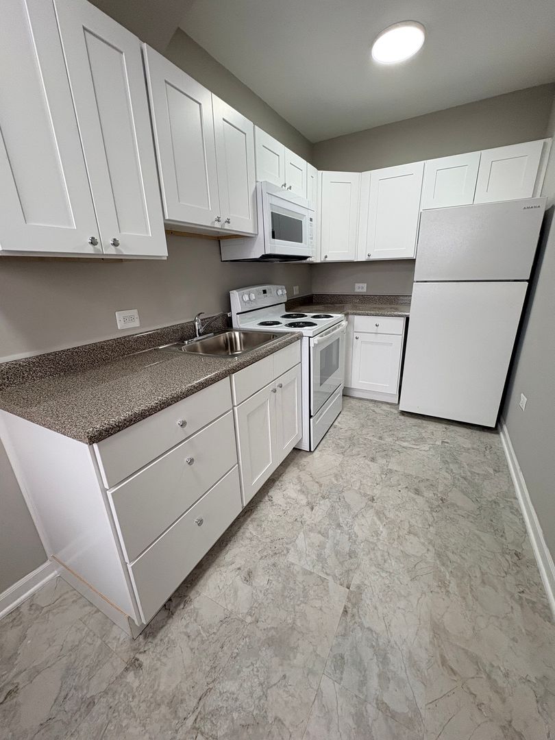 Cozy studio apartment available for rent now on the 2nd floor. This apartment is newly renovated with a white cabinet kitchen, new flooring & carpet throughout. The kitchen is separate from the living space with a dining nook, featuring full size appliances - electric stove, microwave & fridge.