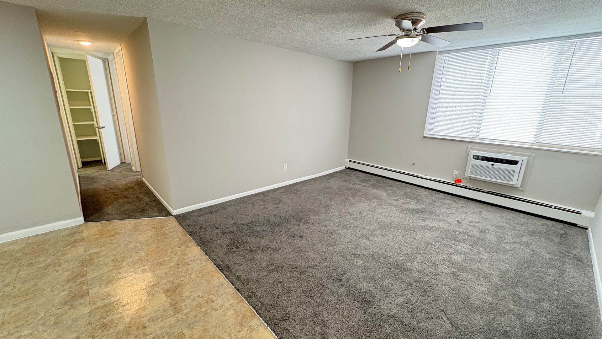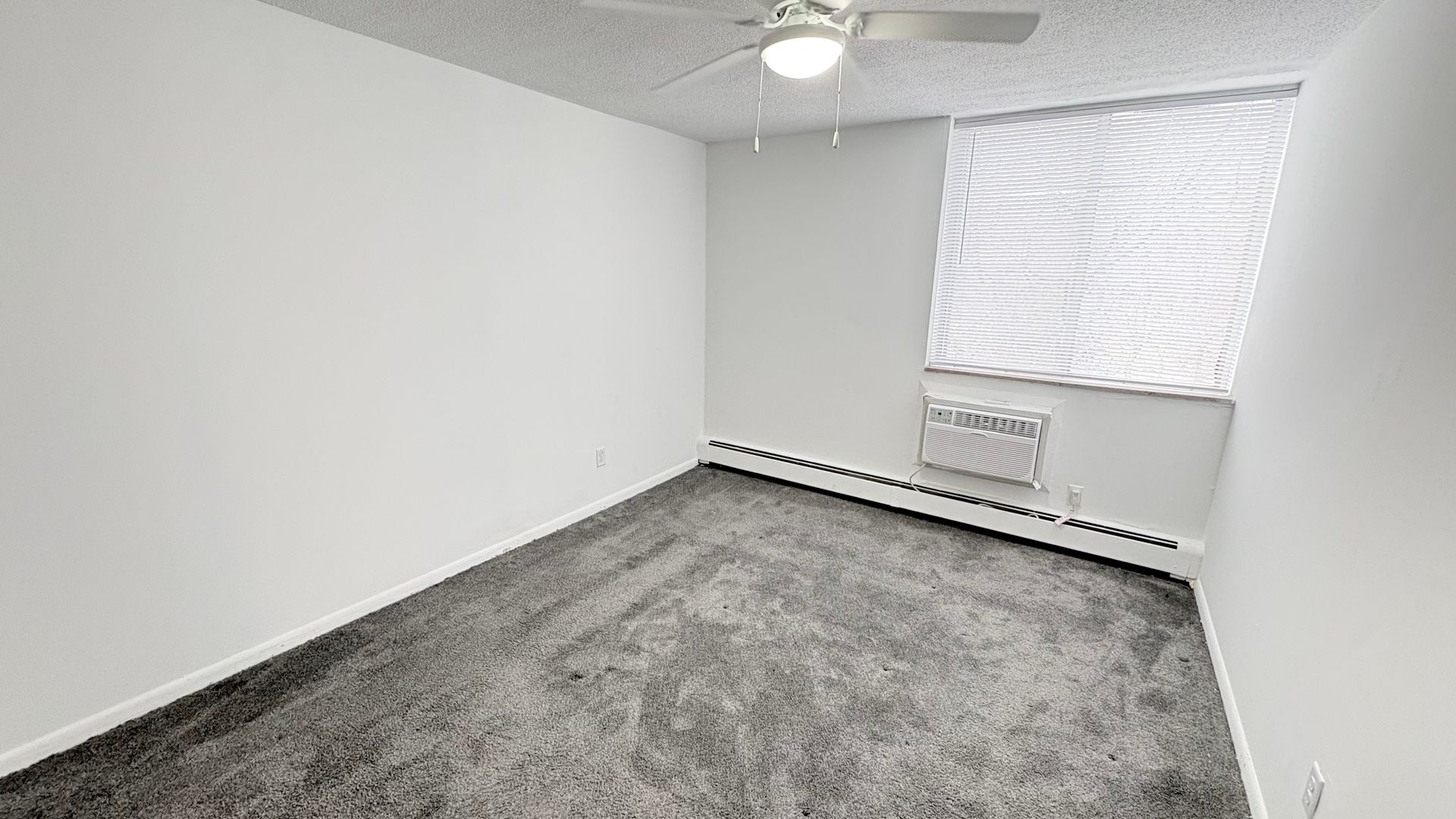 This is a 830 sq ft. third level apartment, with carpet and a bright, updated kitchen featuring a microwave. Modern amenities have been added to the bathroom, along with air conditioning units and floor space-saving ceiling fans in the front room and both bedrooms. Main bedroom includes a roomy walk-in closet.